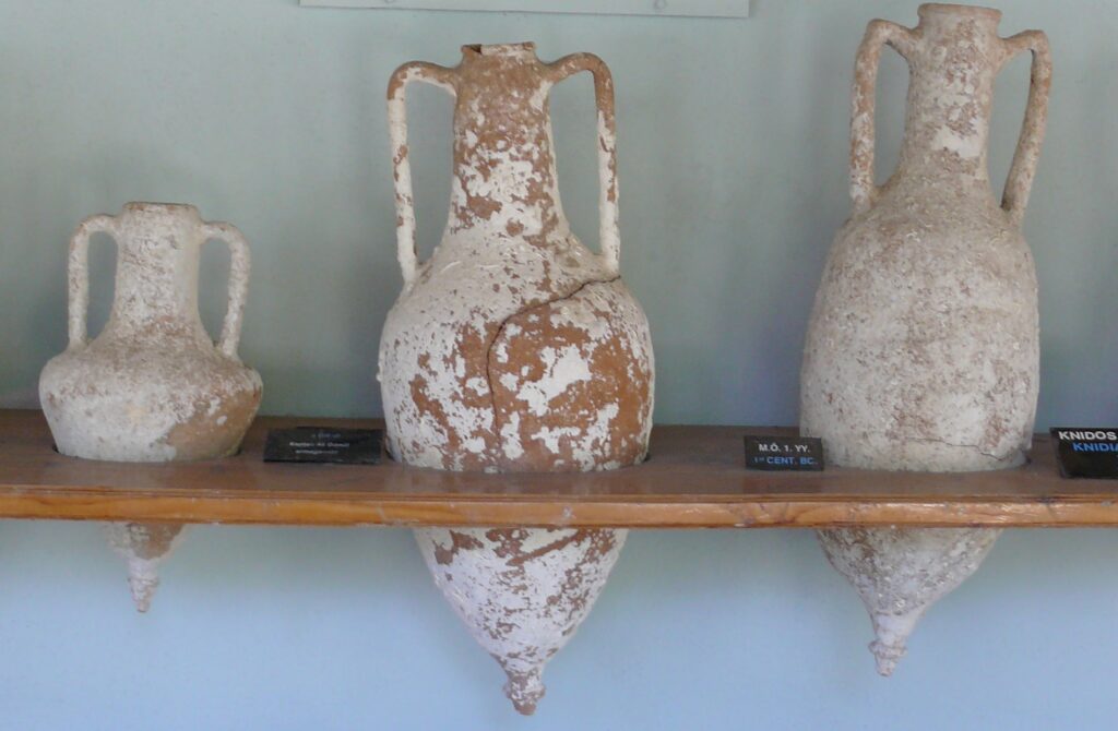 Se encontraron evidencias de residuos de pino, y se cree que la brea de alquitrán de pino podría haber sido utilizada para impermeabilizar las ánforas
