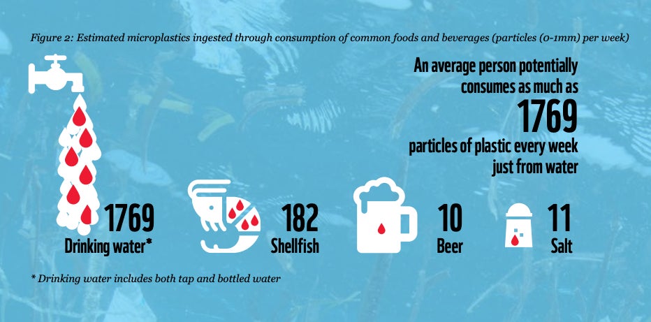 Según el estudio, el mayor problema es el agua, y los alimentos que contienen del agua o proceden de ella. Tanto el agua del grifo como el agua embotellada está llena de micropartículas. La cantidad de estas partículas varía mucho en función del lugar del mundo en el que se tomó la muestra.