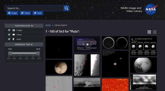 Por ejemplo, si escribimos Plutón aparecerán 543 resultados distintos entre los que se incluyen varias imágenes, diecinueve vídeos y nueve archivos de audio. La mayoría de los resultados también incluyen una pequeña descripción que explica lo que estás viendo en cada vídeo, foto o clip.