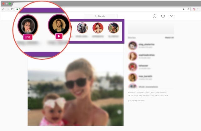 Después de instalarla, accede a Instagram desde la web y ahora verás las Historias de Instagram en la parte superior de la página. Si alguien a quien sigues está transmitiendo un directo actualmente, ese directo aparecerá de primero entre las historias. Para verlo, solo tienes que hacer clic en el directo del mismo modo que puedes hacerlo en tu teléfono.