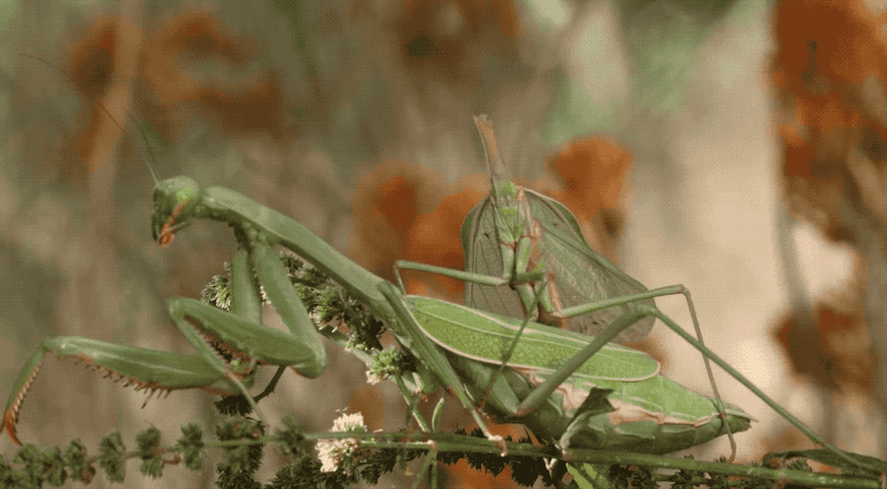 Los machos juegan a la ruleta rusa siempre que encuentran hembras caníbales. Todas las mantis masculinas muestran extrema precaución al acercarse a una posible pareja. Difícil culparlos.