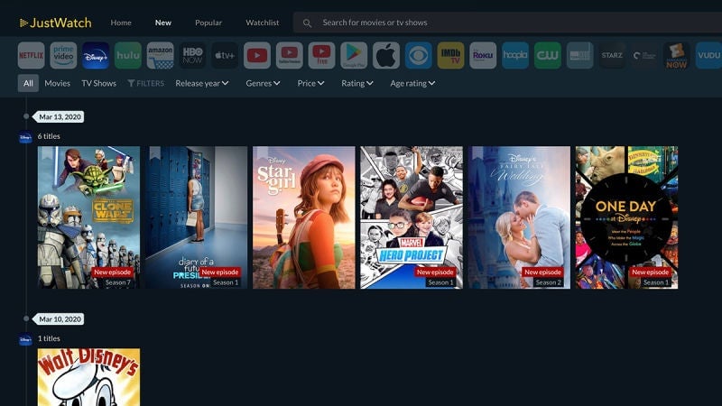 Para eso está JustWatch, que cubre servicios como Netflix, Hulu y Prime Video, así como Disney Plus. Dirígete a la sección Disney Plus del sitio, y puedes ordenar todo, tanto películas como programas y series, en función de la aparición más reciente.