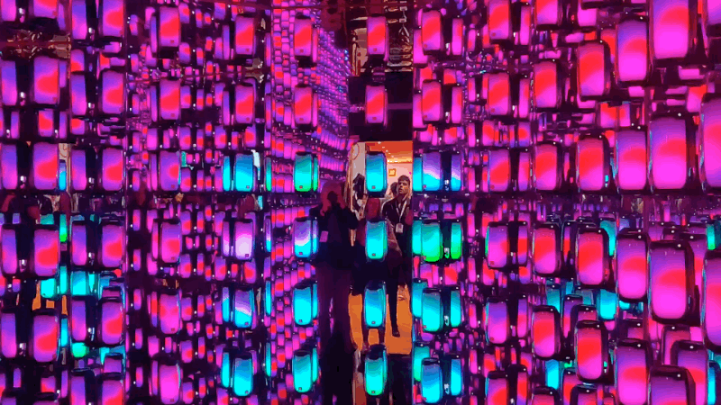 En el stand de Harman en IFA tenían una exhibición consistente en decenas de estos altavoces dispuestos en las paredes de una habitación llena de espejos. Era como entrar al hiperespacio. Para sincronizar el juego de luces, por cierto, no hace falta volver a la aplicación. Basta con agitar el nuevo altavoz que hayamos conectado a la red. Muy intuitivo. También se pueden conectar simultáneamente dos móviles al mismo altavoz vía Bluetooth.