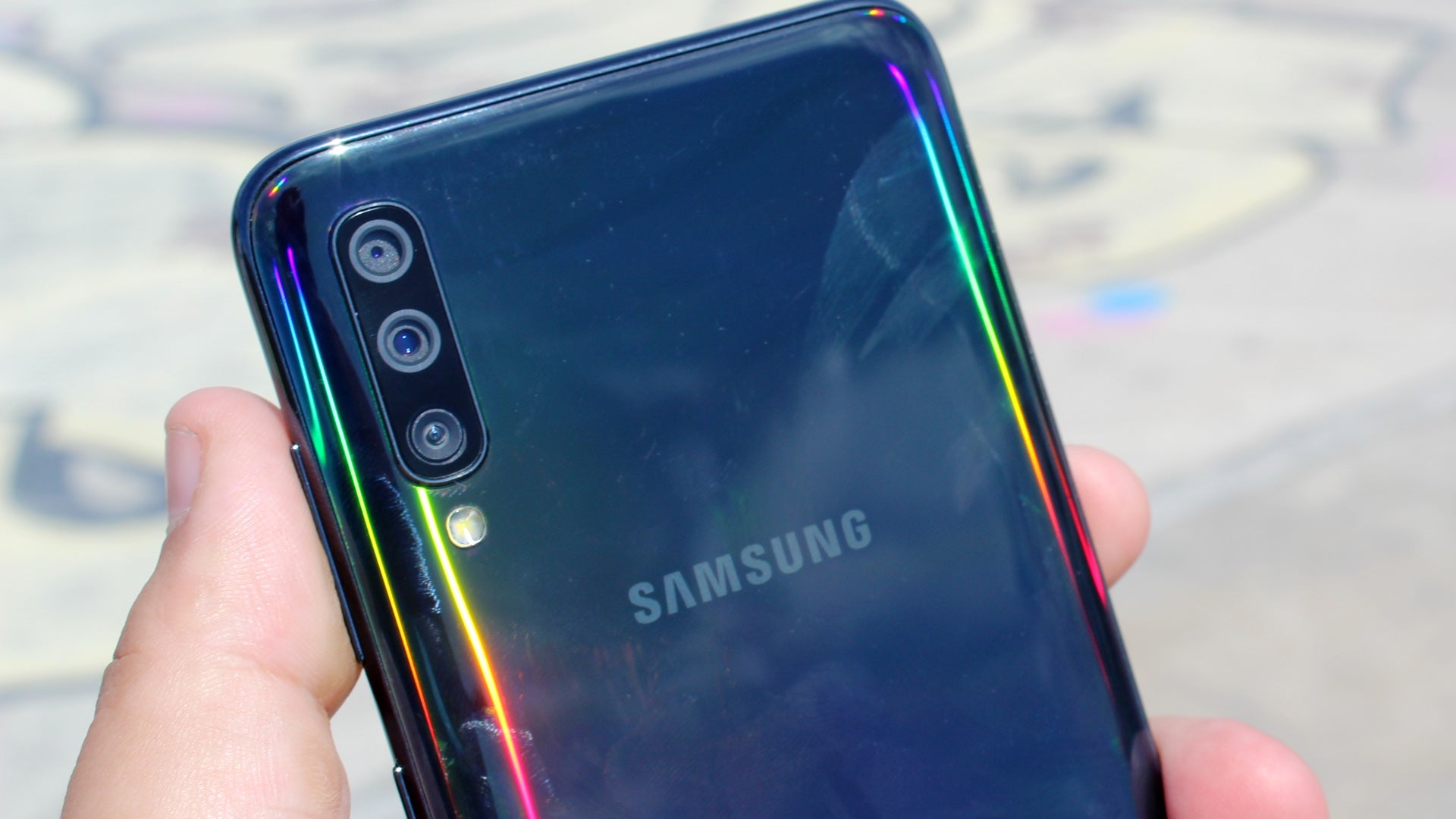 En un primer vistazo, la parte trasera del Galaxy A70 parece minimalista y funcional. Pero si miras con atención, especialmente bajo la luz del sol o de los focos, puedes ver que el material refleja un arcoíris de colores. La tapa no es de vidrio, sino de plástico, y no da la sensación de ser barata.