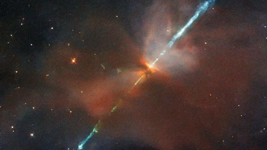 Lo que ves ahí arriba es, en palabras de la NASA, un “fenómeno celeste relativamente raro”, conocido como objeto Herbig-Haro. Estos espectaculares objetos se forman en circunstancias muy concretas. En ocasiones, las estrellas recién formadas expulsan chorros de gas ionizado a gran velocidad. Esas corrientes de gas ionizado luego chocan con las nubes de gas y polvo que rodean a las estrellas recién formadas, formando los objetos Herbig-Haro y dejando esa espectacular y brillante estela que ha podido capturar el Hubble.