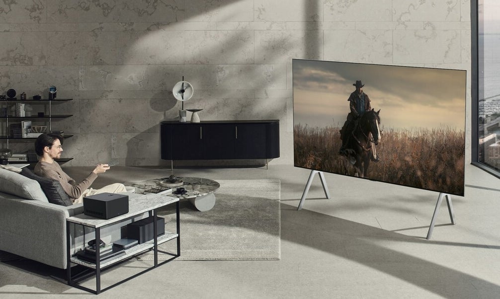 Teniendo eso en cuenta, podemos entender a qué se refiere LG con que su nuevo Signature OLED M es “inalámbrico”. El televisor funciona mediante una “caja” llamada LG Zero Connect, con la diferencia de que esta no se conecta al televisor mediante un cable. No, sencillamente se puede colocar en una distancia prudente de la pantalla (máximo 10 metros) y la caja transmitirá de forma inalámbrica todo el contenido que estemos viendo. La caja se encargará de recibir la conexión a cable, consolas, barras de sonido y todo lo demás.