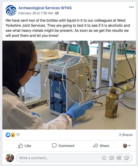 ¿Recuerdas esas botellas que encontramos? ¡Bueno, el análisis ha llegado!, escribió el grupo de arqueología en una publicación de Facebook del 20 de marzo de 2020.