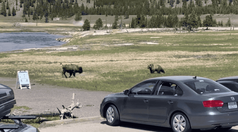 Yellowstone es una maravilla natural en la que los seres humanos somos solo visitantes. No es nada raro encontrar animales cerca de las zonas de paseo, y tampoco es raro que alguno de esos animales sea peligroso. Lo que ya no es tan común es toparse con un oso Grizzly y un bisonte matándose al salir del coche.