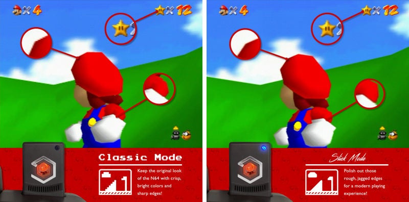El adaptador lo único que hace es escalar la imagen, no mejorarla (no podrás jugar a The Legend of Zelda: Ocarina of Time en 4K), pero se puede jugar en dos modos diferentes: Modo clásico, que conserva todo el aliasing de la N64 (verás bordes de sierra si lo ves muy cerca) y un Modo Suave que parece aplicar algún tipo de anti-aliasing que suaviza todo.