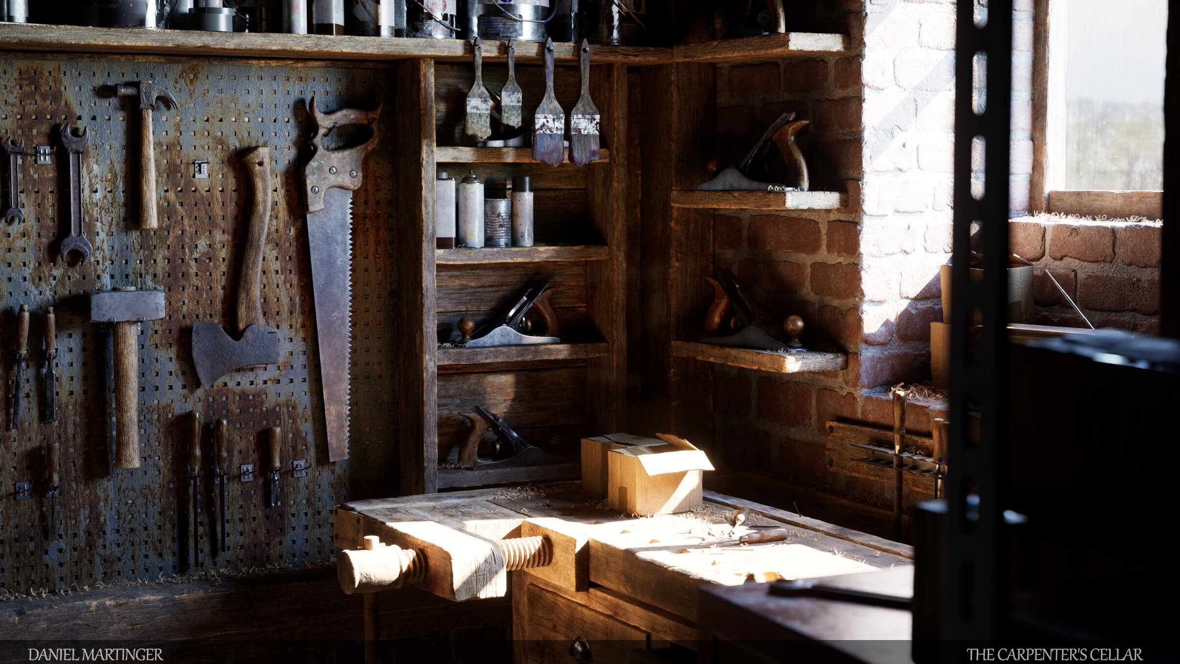 Una pequeña bodega en el campo de Suecia, donde un hombre mayor pasa su tiempo haciendo carpintería. He creado todo desde cero, no se han utilizado fotoscanes. excepto la textura de metal oxidado en la “pared de herramientas” y la textura del suelo. (Son de Quixel). Usé Zbrush, Substance Painter y Maya para activos y texturas de mosaico.