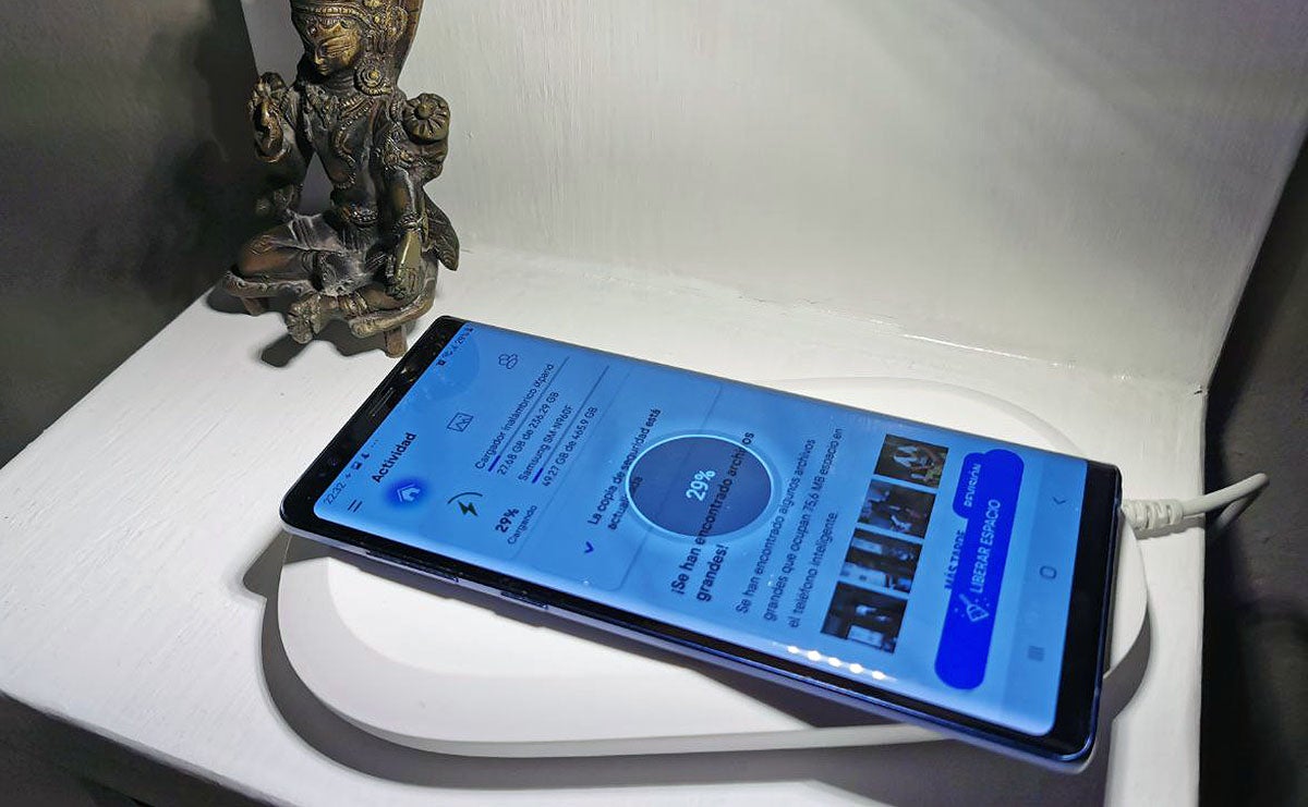 El móvil debe estar bastante centrado sobre la base (si lo posamos lejos del centro no carga) y no permite cargar varios dispositivos a la vez. Por fortuna, la carga funciona sin tener que retirar la funda por muy gruesa que sea esta. Según mis pruebas carga hasta separado hasta unos tres milímetros de la base, que es una distancia muy superior al grosor normal de una funda. Tampoco he observado que el móvil se caliente especialmente.