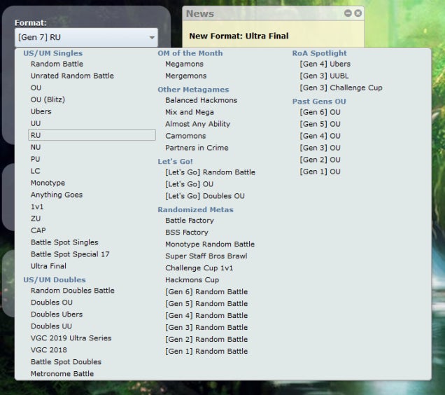 “Es divertido y fácil de usar”, cuenta Luo, “y es un juego web que no requiere instalar nada”. En todo caso, Luo lo está vendiendo más bien poco. Para empezar, Pokémon Showdown ofrece a los jugadores innumerables formas de jugar, mucho más que los juegos oficiales de Pokémon. Puedes seguir las reglas de Battle Spot para simular cómo serían las batallas en tu 3DS, o usar las reglas del Pokémon Video Game Championships para practicar en torneos oficiales. Pero las opciones no se detienen allí. Puedes usar equipos generados aleatoriamente, desarrollar un equipo de Pokémon que comparta un solo tipo para luchar contra otros equipos siguiendo las mismas reglas de construcción de equipos, o crear cuidadosamente la fiesta perfecta para subir en el sistema de niveles hecho por fans conocido como niveles Smogon.