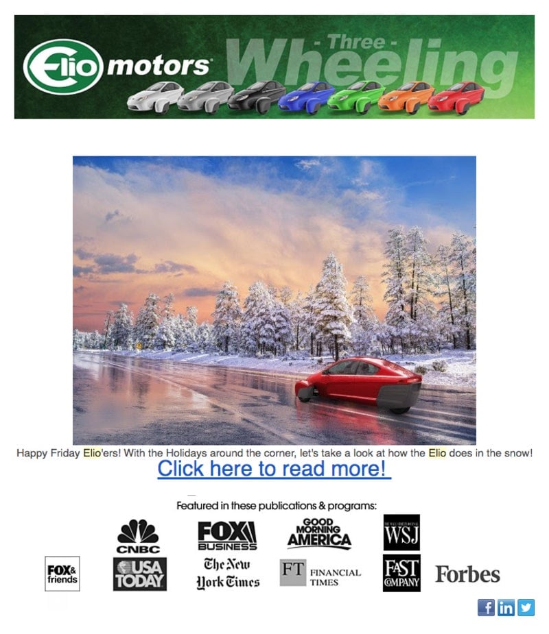 De hecho, me sorprende seguir recibiendo boletines informativos por correo de Elio todos los meses, escritos de una manera delirantemente optimista que nunca revela que este automóvil se ha retrasado por años y años y años y de ninguna manera es probable que sea una realidad.