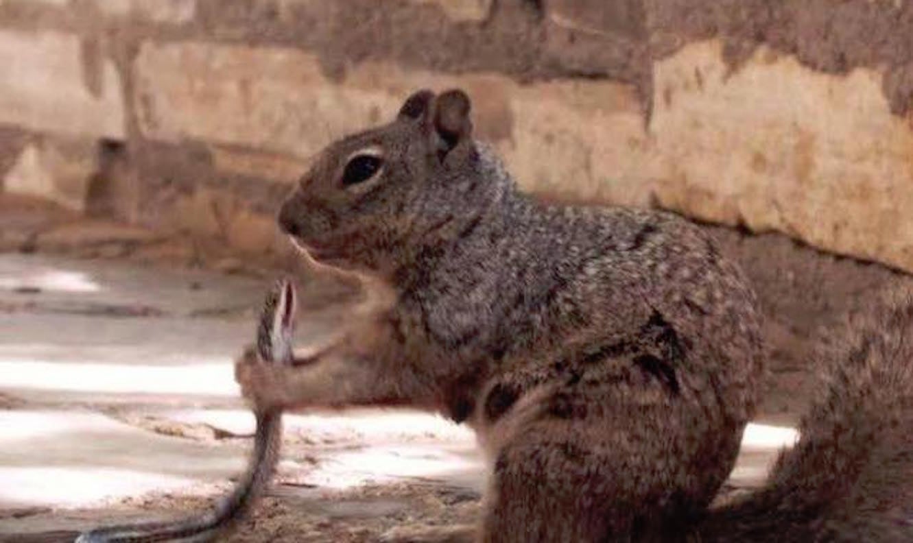 Lo que vemos en la instantánea: una ardilla de roca (Otospermophilus variegatus) que usa ambas patas para agarrar lo que se identifica como una culebra del desierto (Masticophis taeniatus), justo debajo de la cabeza de la serpiente.