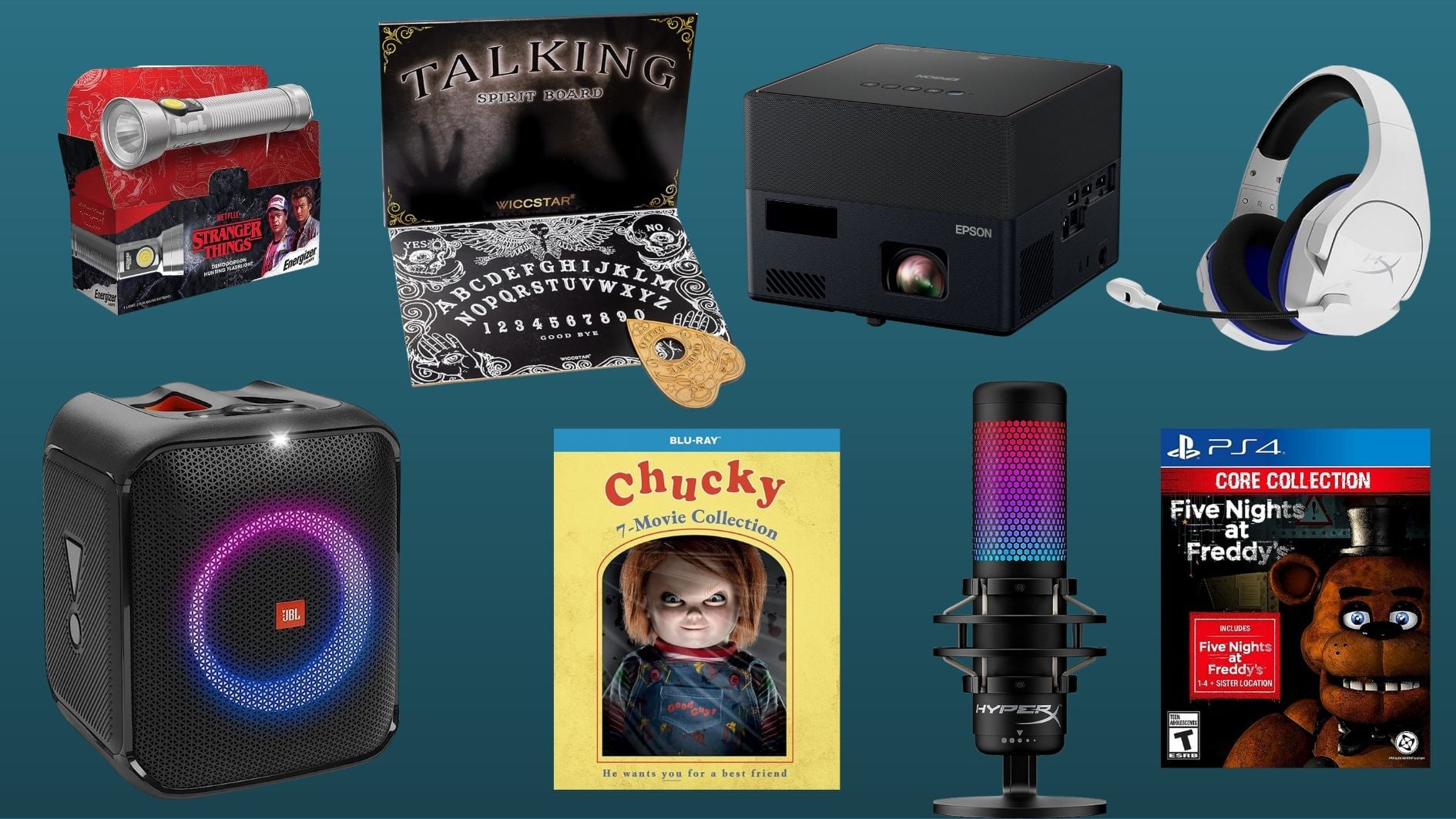 Con cajas de películas de terror clásicas, proyectores, barras de sonido y transmisiones en vivo de Twitch, te tenemos cubierto de ideas. para noches de películas de terror. O si lo que más te gusta son las noches de juegos o las pijamadas divertidas, contactar con espíritus dormidos, aquí también hay cosas buenas para eso. Y claro, si estás fiesta de disfraces Mientras te preparas, hay una variedad de parlantes para marcar tu lista de reproducción de Monster Mash de tu elección.