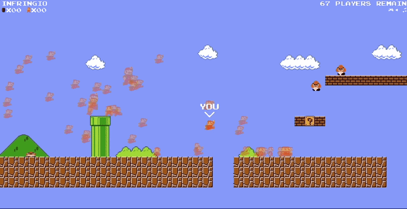Mario Royale, que actualmente se puede jugar en navegadores web, es la creación de un YouTuber y programador llamado InfernoPlus y enfrenta a 75 jugadores entre sí en una carrera a través de un mundo de Super Mario Bros. o The Lost Levels. Los jugadores no pueden interactuar directamente entre sí (un Mario no puede pisotear a otro Mario), pero los poderes como las flores de fuego y las estrellas de invencibilidad permiten que los jugadores se enfrenten entre sí. Ese no es realmente el punto; Mario Royale es una especie de carrera colectiva hasta el final. Solo los tres primeros jugadores que lleguen al final de los cuatro niveles terminarán en el pedestal del ganador. El verdadero desafío es asegurarte de que tus habilidades de plataforma estén a la par y de que puedas evitar las goombas y los saltos en medio de todo el caos.