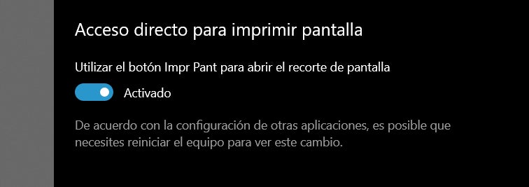 Puedes abrir la barra de recortes directamente con la tecla Impr Pant si activas la opción “Utilizar el botón Impr Pant para abrir el recorte de pantalla” en el menú Inicio > Configuración > Accesibilidad > Teclado.