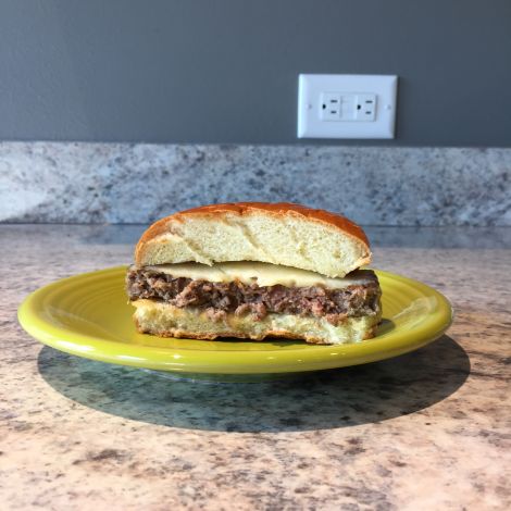 La hamburguesa en sí era delgada y gris y daba la impresión de haber sido recientemente desalojada de una envoltura de plástico; no ibas a confundir esto con nada formado por manos humanas.