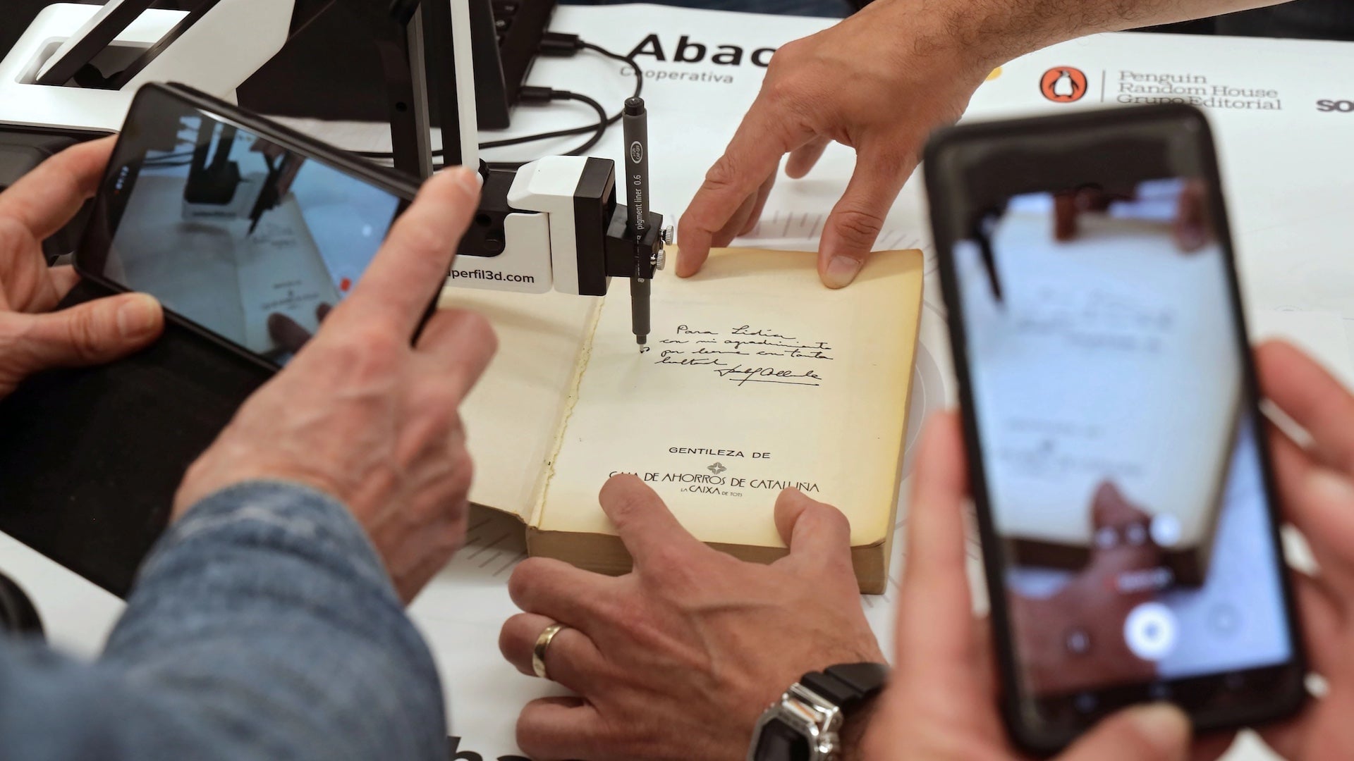 La cooperativa Abacus, la editorial Penguin Random House y SolidPerfil3D, una empresa de impresión 3D, se han asociado durante Sant Jordi para conectar virtualmente a autores y lectores a través de la tecnología. Su iniciativa consiste en usar un brazo robot para que los primeros puedan firmar a distancia los libros que les compran estos últimos.