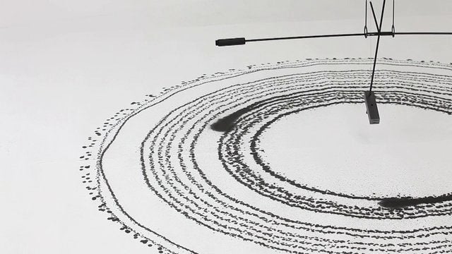 El invento consiste en una botella de tinta que se mantiene en precario equilibrio con un imán en el otro extremo. A medida que gira, el campo magnético de la tierra interactúa con el imán alterando su rumbo. Por otra parte, la fuerza gravitatoria hace descender la botella y provoca que las pequeñas gotas de tinta Sumi que salen de ella caigan en distinta posición y con diferente diámetro.