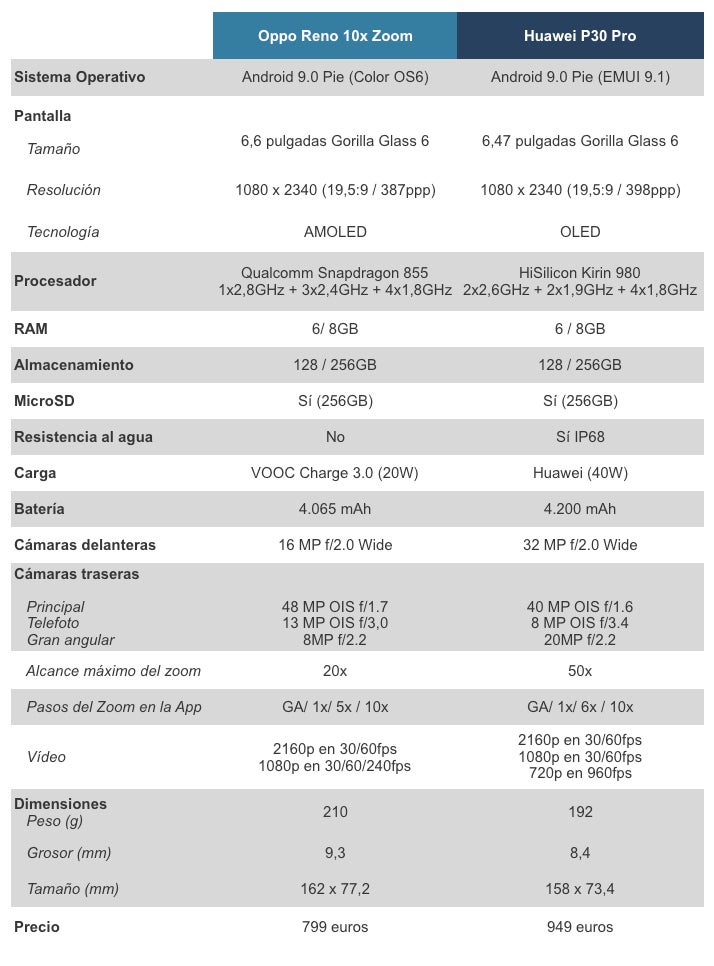 Oppo 10x Zoom Vs Huawei P30 Pro: Características técnicas