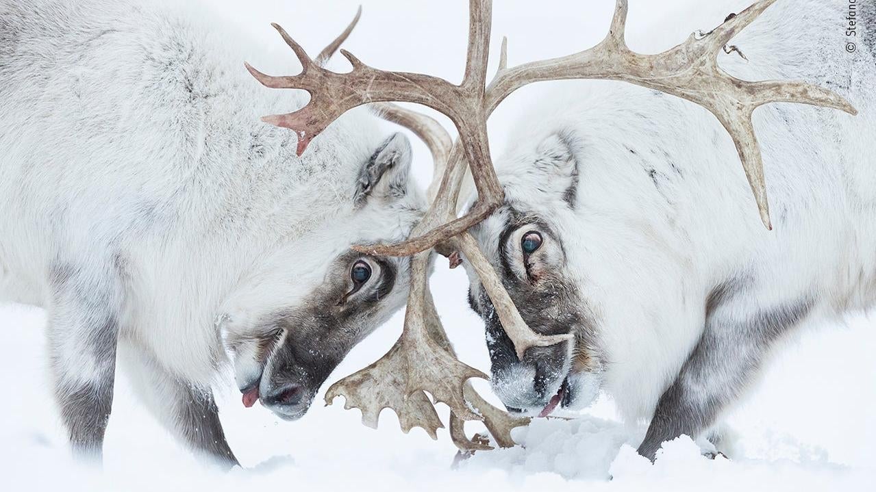 El italiano Stefano Unterthiner se topó con dos renos en Svalbard que estaban luchando por un grupo de hembras. Esta foto ganó el primer premio en la categoría “Mamíferos”.