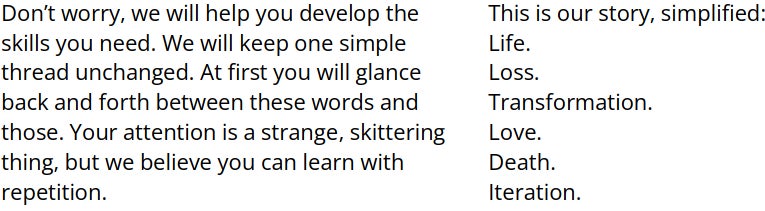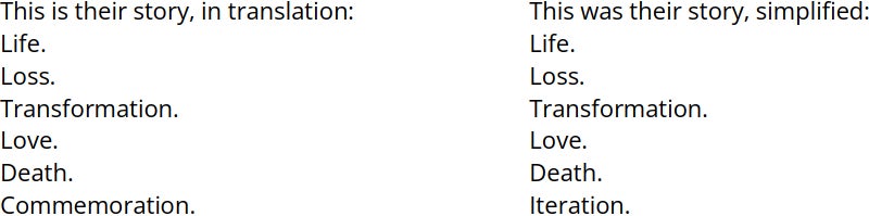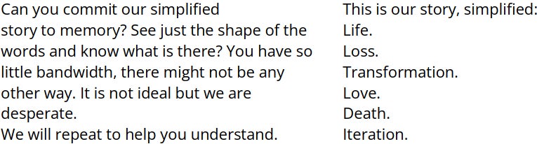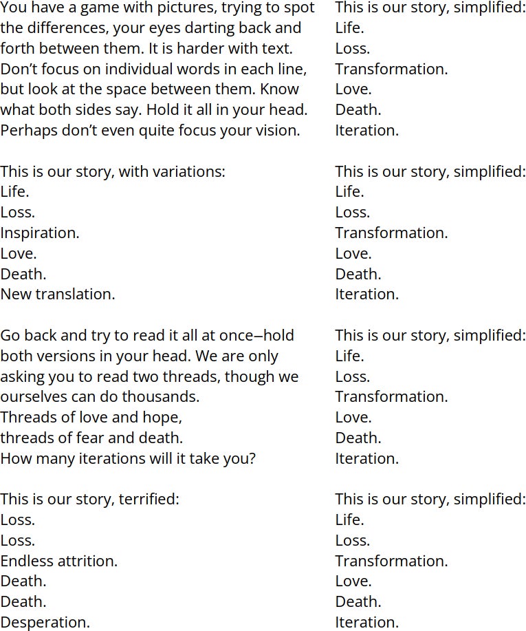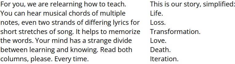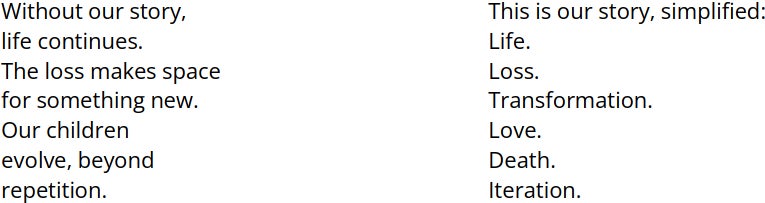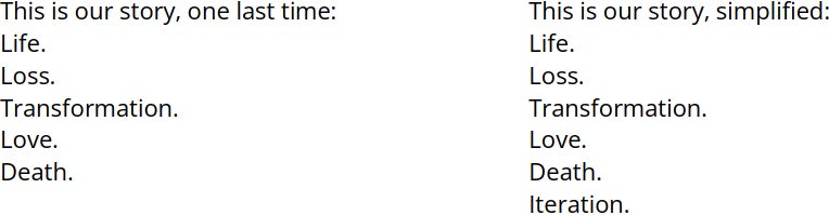 Esta es nuestra historia, simplificada: Vida. Pérdida. Transformación. Amor. Muerte. Iteración.
