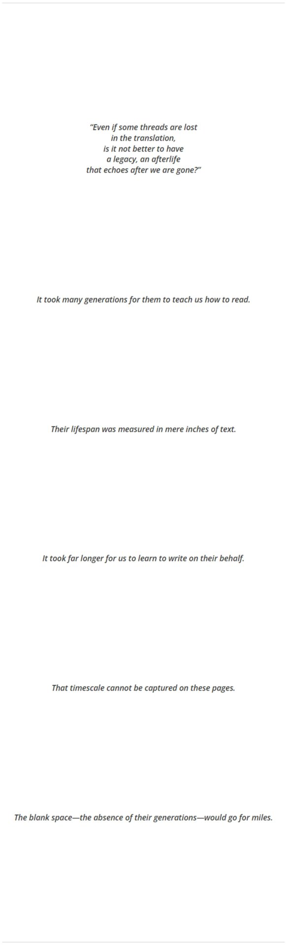 La toda su historia tiene miles y miles de hilos. Es una historia contada en momentos que parecen suceder todos al mismo tiempo. Es ciencia que progresa en incrementos casi infinitamente pequeños y, sin embargo, contiene descubrimientos que incluso ahora no comprendemos completamente. su arte, su idioma, su cultura: todo lo que estaban decididos a preservar. Nos queda mucho por traducir; este es sólo el comienzo.