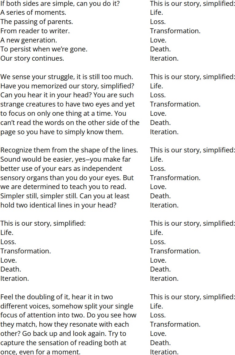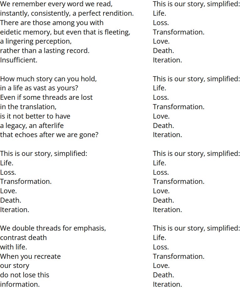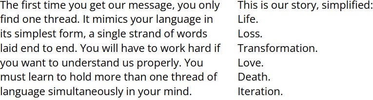 Regálale esta historia a tus hijos, junto con todo lo que hemos logrado traducir, y tal vez algún día la historia se abra camino. de regreso a los descendientes lejanos de quienes lo crearon: entidades efímeras que, en las generaciones finales de su declive, nos enseñaron una nueva manera de leer. Cuando enseñe esta historia a sus hijos, no comience con todos los hilos a la vez. En sino, comience con una sola línea de texto: