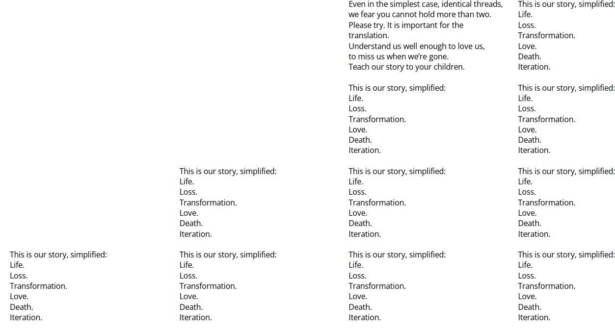 …y colocamos al lado todas las variaciones, todas nuestras explicaciones, todo lo que normalmente leemos como un solo flujo de texto cortado en piezas y se colocan una al lado de la otra para que podamos encajarlas todas dentro de nuestra vida, cada generación agregando una nueva columna a la historia, extendiéndola cada vez más.