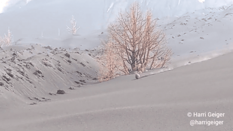 El geoquímico Harri Geiger de la Universidad Albert-Ludwigs de Alemania está investigando las erupciones en curso en el volcán de Cumbre Vieja en la isla de La Palma, en España. El volcán entró en erupción el 19 de septiembre y no parece estar interesado en detenerse pronto. Geiger forma parte de un equipo de investigación internacional coordinado por la Universidad de Las Palmas de Gran Canaria. Él y sus colegas estaban tomando muestras de cenizas en la zona de exclusión del volcán cuando la roca hizo su dramática aparición.