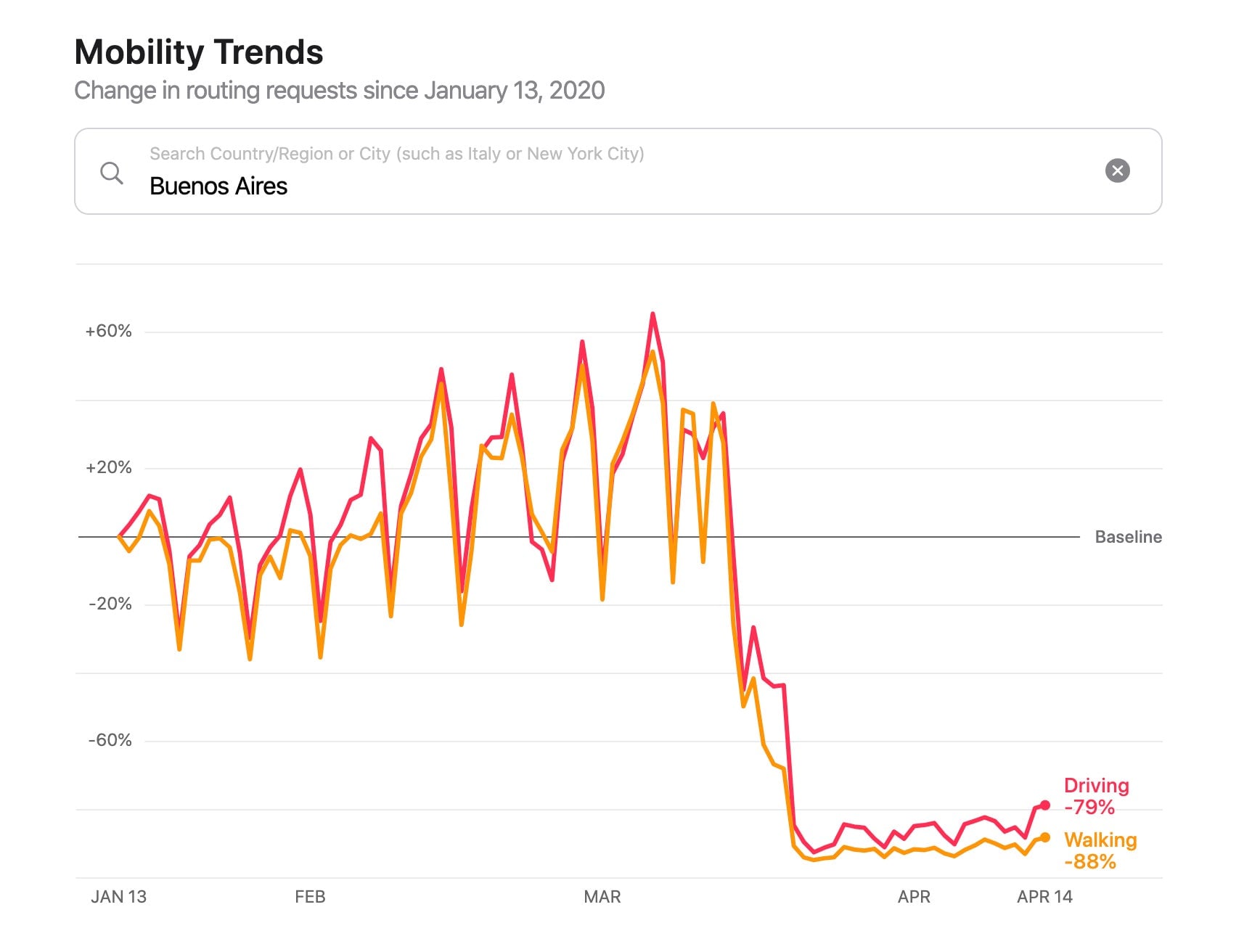 A diferencia de los de Google, los Informes de Tendencias de Movilidad de Apple permiten buscar información por países, regiones y grandes ciudades. Apple utiliza, además, un método distinto al de Google para estimar esos movimientos: en lugar de rastrear por dónde se mueven sus usuarios y anonimizar los datos, toma las ubicaciones o estaciones de transporte público a las que la gente solicita ir en Apple Map y las compara con meses anteriores.