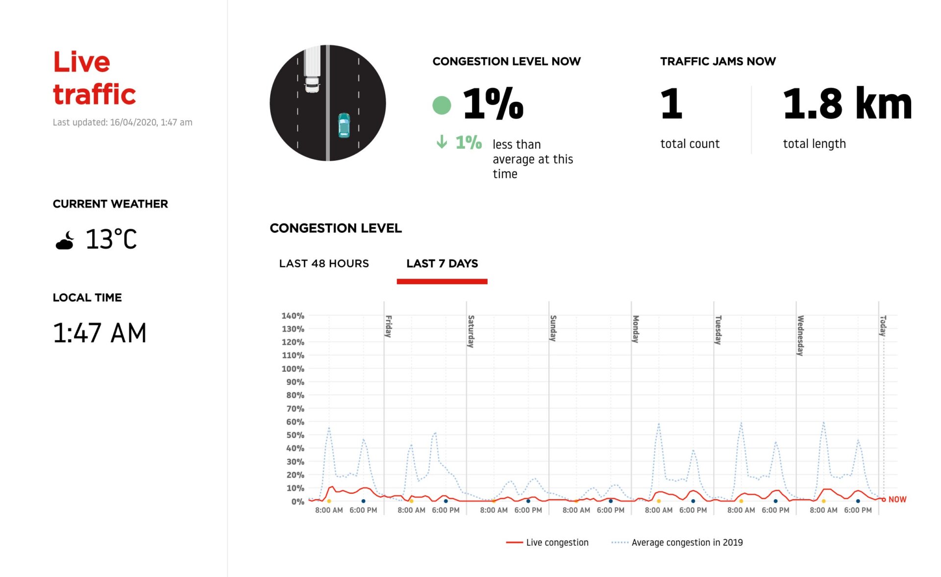 Por último, si estás buscando datos en tiempo real, deberías probar el Índice de Tráfico de TomTom. Buscas una ciudad en concreto y bajas hasta la gráfica que compara el tráfico de las últimas 48 horas o de los últimos 7 días con la media de 2019. Hay más ciudades que en Apple Maps, y TomTom añade datos específicos de tráfico como el nivel de congestión o el número de atascos.