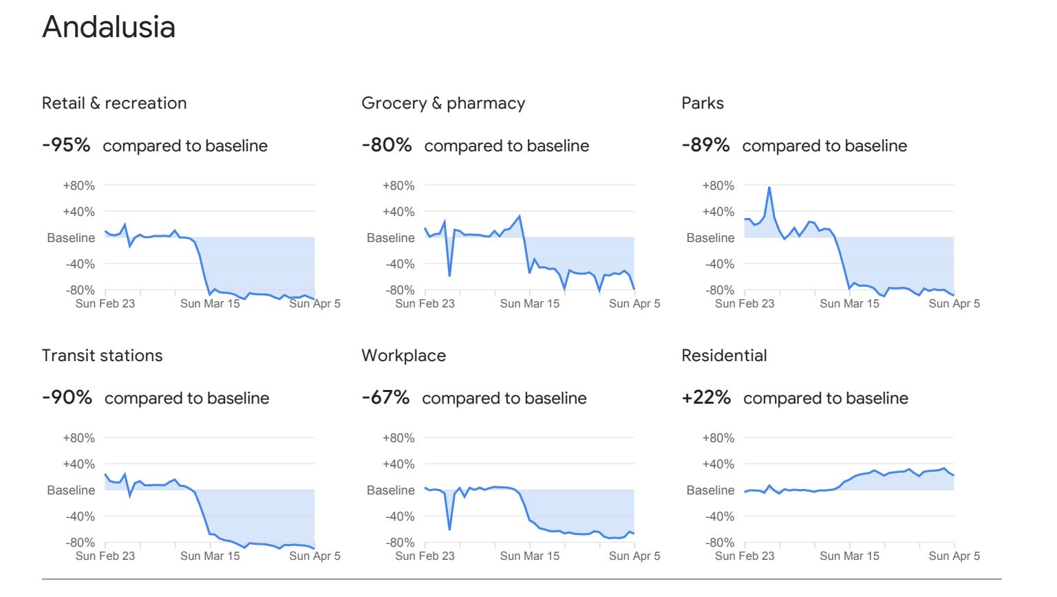 Google fue la primera empresa en publicar un informe global a partir de datos agregados y anónimos de Google Maps. Los Informes de Movilidad Comunitaria son una serie de PDFs actualizados por última vez el 9 de abril que muestran cómo han cambiado los movimientos por estados o provincias.