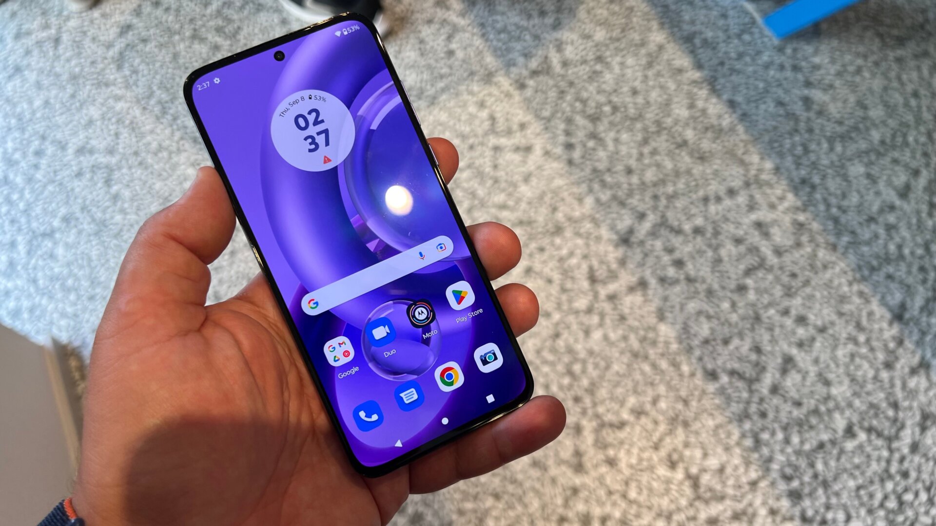 El sello de la casa de My UX, la interfaz de Motorola, es que apenas toca el Android de stock, y eso es una decisión que celebro. El Moto Edge 30 Neo lleva Android 12 con algunos añadidos prácticos y muy pocos retoques estéticos, entre ellos un par de widgets personalizados y la opción de cambiar los colores de la interfaz por los colores Pantone de los teléfonos. Por defecto, el Edge 30 Neo en Very Peri viene con tema morado, fondo de pantalla morado y un widget de reloj del mismo color.