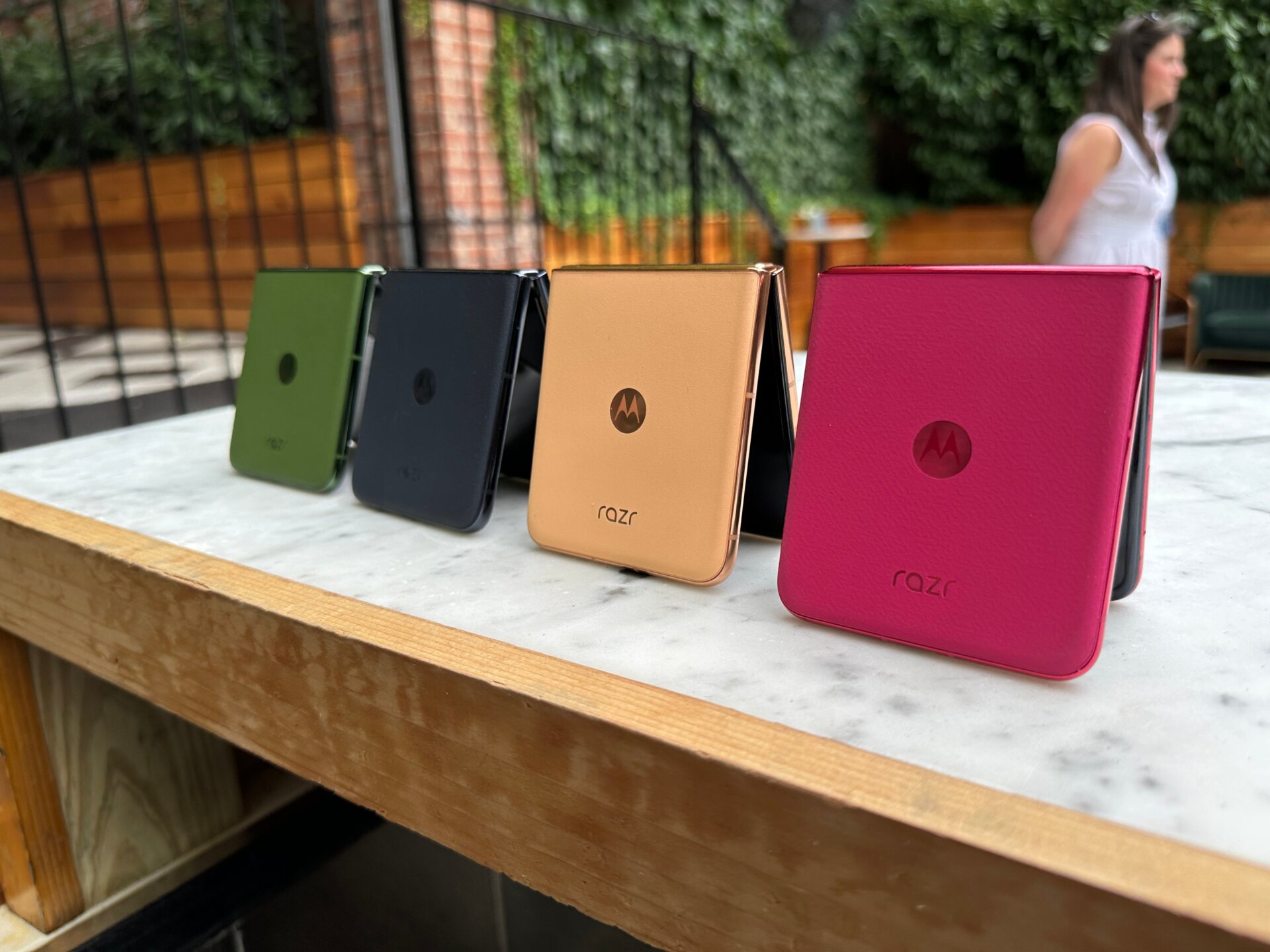 Hay algunas opciones de colores bastante llamativos disponibles para ambos modelos. Puedes conseguir ese clásico Razr Pink y un agradable verde oscuro y azul en el teléfono de $1,000. El Razr más barato viene en dos tonos de gris bastante apagados, pero también en un brillante “naranja Spritz” que inmediatamente me puso en desacuerdo con mis compañeros de trabajo. Cuanto más lo miro, más me gusta, incluso si Se considera el cono de tráfico de su grupo de amigos inmediatos. No hay respaldos de vidrio en ninguna de las alineaciones del Razr 2024. En cambio, es todo “cuero vegano” y “gamuza vegana”. Por mucho que desearía que pudiéramos eliminar el mensaje de lavado verde de En los teléfonos producidos en masa, significa que las partes traseras son mucho menos propensas a rayarse cuando las colocas de lado.