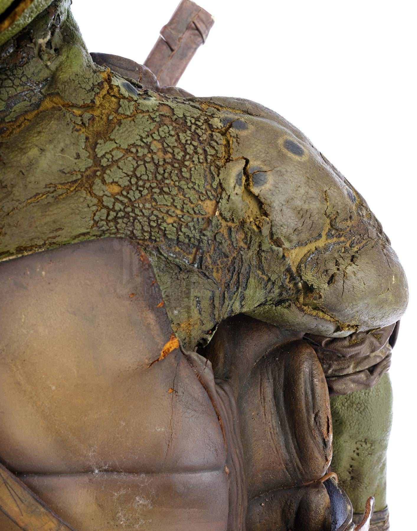 Este disfraz incluye un traje de tortuga verde que consiste en elementos de espuma de látex sobre una base de spandex, con elementos de cofre y caparazón de espuma densa, rodilleras y coderas de cuero, y una configuración de funda de cuero para las espadas de Leonardo. La cabeza incluida es una versión que también utiliza una piel de látex de espuma sobre una base de spandex, con dientes de resina fundida, ojos de alta calidad, un pañuelo de tela, forro interno de casco para el artista y una cremallera en la parte posterior para permitir que la pieza se cierre. Tanto el cuerpo como la cabeza del disfraz muestran una descomposición sustancial de los elementos de látex de espuma y requieren restauración. Actualmente, el cuerpo está lleno de algo de relleno y descansa en un hangar de ropa de gran tamaño; se necesita trabajo adicional para que la pieza se sostenga. Dimensiones (cabeza adjunta): 185.5 cm x 81.25 cm x 38 cm.