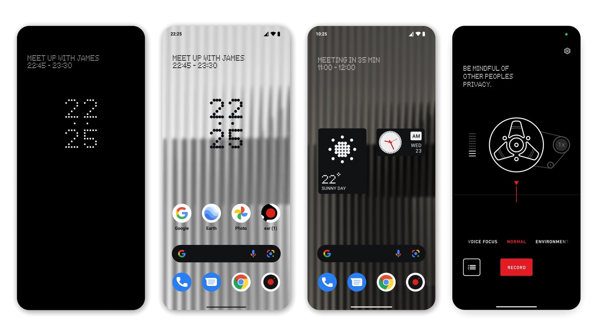 El teléfono llamado simplemente phone (1) se reveló en un evento de Nothing, y aunque los detalles y las especificaciones aún son escasos, el phone (1) se ejecutará en la plataforma de chips Snapdragon de Qualcomm y contará con una versión optimizada de Android que se ha minimizado a su elementos esenciales, el cual han llamado Nothing OS. La compañía presentó un puñado de capturas de pantalla de Nothing OS que revelan un lenguaje de diseño único que incluye fuentes personalizadas y elementos gráficos, y una vista previa estará disponible a través del Launcher personalizado de Nothing OS que se podrá descargar en ciertos teléfonos Android a partir de abril.