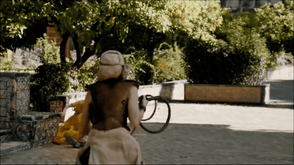 Durante su intento fallido de capturar a Myrcella, puedes ver que la mano derecha de Nymeria cambia instantáneamente de sujetar su látigo a empuñar su daga, que anteriormente estaba en su mano izquierda. No hay indicios de que deje caer el látigo y cambie de arma, ni tiempo para hacer algo así. Normalmente, perdonaría el fallo, pero amenazar a Myrcella con la daga es lo que consigue que coopere.