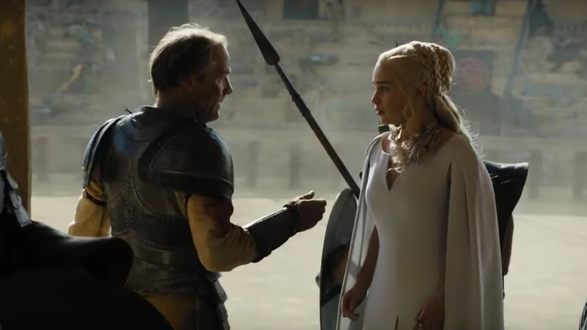 Justo cuando pensabas que no iba a lograr sorprenderte, me dejo lo mejor para el final. Elegí no incluir errores de manos o partes del cuerpo que cambian de lugar entre tomas porque es mucho pedir a los actores que recuerden exactamente cómo colocaron su cuerpo la última vez, especialmente cuando intentan meterse en el personaje. Esta escena, en la que Jorah toma a Daenerys de la mano para protegerla de los Hijos de la Arpía, no está aquí porque eso. Está aquí porque es un error que podría haber matado a Dany.