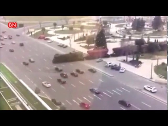 La búsqueda en el mapa delata la primera mentira. No es cierto que no haya vías, como insinúa este hilo de Reddit; están ahí, pero no son visibles por la pésima calidad del vídeo. En este GIF, extraído de un vídeo que se grabó en la misma calle de Bakú (pero varios años antes), se puede ver que las vías están integradas en el asfalto y cuesta distinguirlas incluso a nivel de calle: