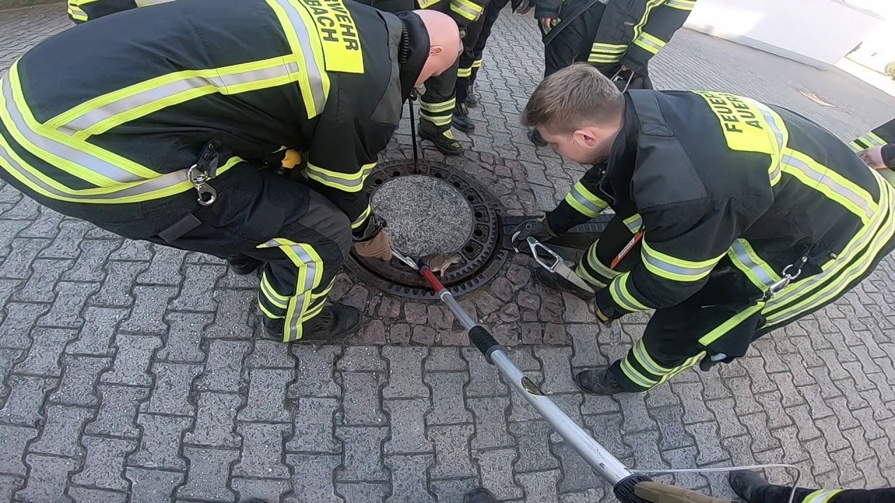 Todos los días no se ve un rescate de este calibre. Diríamos que incluso forma parte de un selecto grupo de operaciones de salvamento épicas. Lo que vemos: al cuerpo de bomberos de Auerbach acudiendo a salvar a una enorme y obesa rata atrapada en la tapa de una alcantarilla.