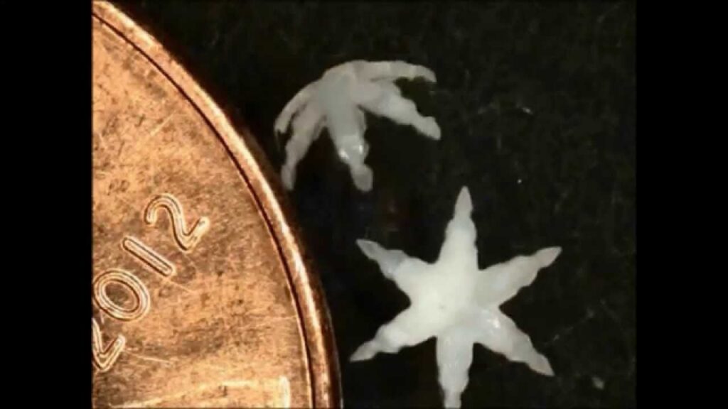 Estas diminutas estrellas de mar son unos nuevos microrrobots desarrollados por investigadores de la Universidad Johns Hopkins en Baltimore, Estados Unidos. Aunque apenas miden medio milímetro de diámetro, una vez liberados en el aparato digestivo son capaces de realizar una biopsia de colon sin que el paciente siquiera lo note. Robots pequeños para un avance…