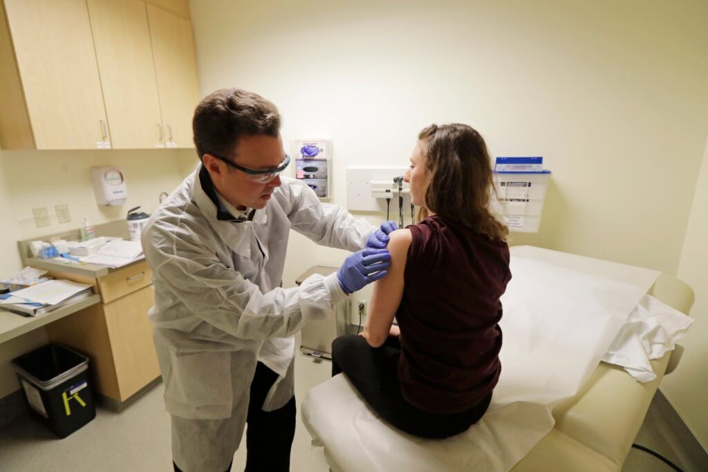 Las imágenes pertenecen a los primeros ensayos en humanos de una posible vacuna contra el coronavirus (SARS-CoV-2) en el Kaiser Permanente Washington Health Research Institute (KPWHRI) en Seattle. La vacuna se inyectó en cuatro voluntarios, aunque los resultados de su efectividad tardarán un mínimo de un año en conocerse. Llamada ARNm-1273, la nueva vacuna se…