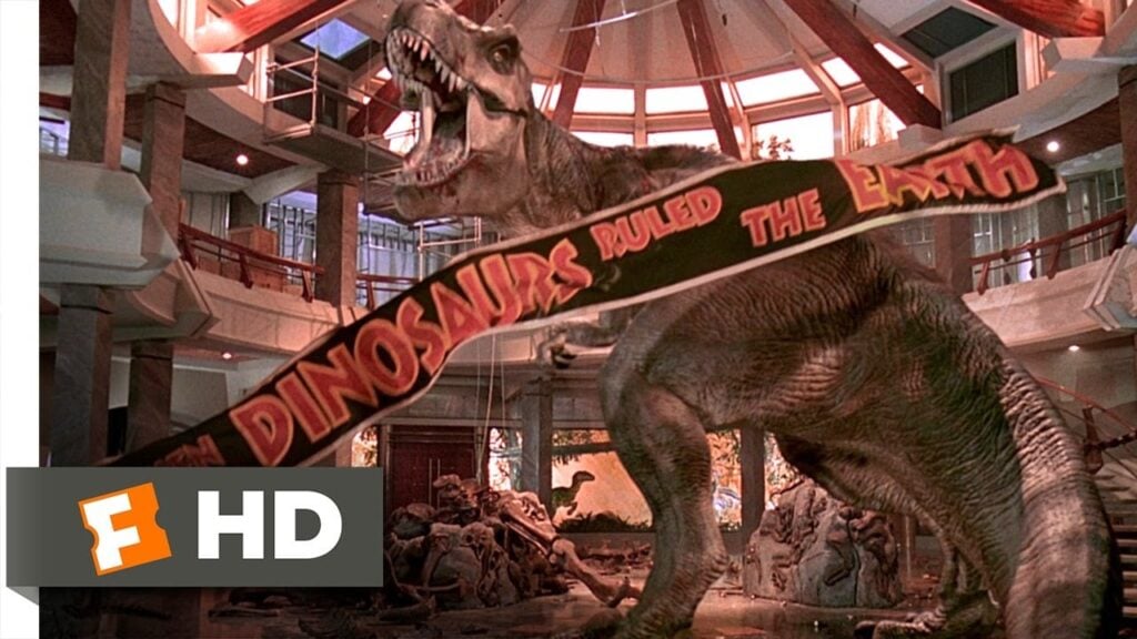 Es difícil olvidarse del final de Jurassic Park, con esa escena en el museo en la que el T-Rex salva a los protagonistas de la película de ser devorados por los velociraptores. Curiosamente, la escena original no transcurría así. De hecho, en ella ni siquiera hacía acto de presencia el tiranosaurio. Esta es la escena…