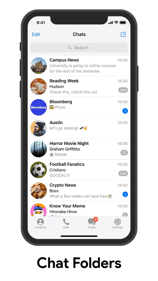 Si tienes demasiados chats, ahora puedes organizarlos en pestañas desde Ajustes > Carpetas. Puedes crear pestañas personalizadas (“Trabajo”, “Memes”) o usar filtros predefinidos para que se organicen solas (“Canales”, “Sin leer”).