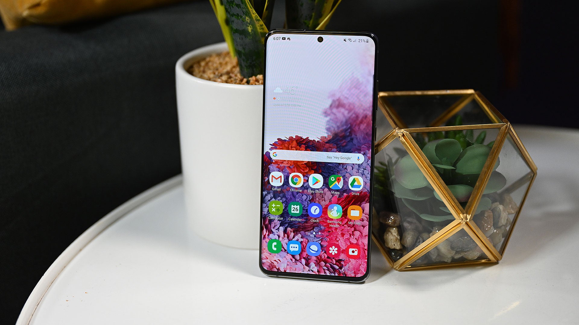 Este año, Samsung ha tomado la decisión de poner las curvas pronunciadas en el panel trasero en lugar de la pantalla, lo que me parece un acierto. La pantalla sigue estando ligeramente curvada, pero no tanto como la de los predecesores del S20. En mi experiencia, las pantallas curvadas solo tienen un beneficio estético: me parecen bonitas, pero no les encuentro ninguna utilidad práctica; de hecho, producen sombras visibles desde ciertos ángulos.