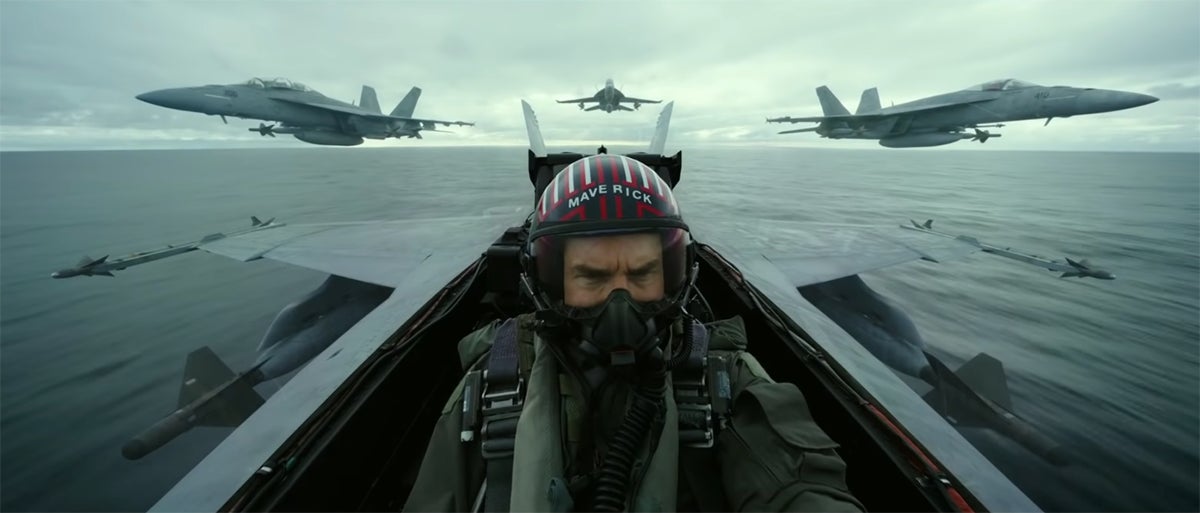 Hacia el final del trailer, Maverick lidera una formación de Super Hornets. Cada uno lleva dos misiles AIM-9X Sidewinder y dos bombas GBU-24 de 900 kilos guiadas por láser. El dispositivo a la izquierda del fuselaje es un sistema de puntería AN/ASQ-228 Advanced Targeting Forward Looking Infrared pod (ATFLIR). ¿El problema? Los jets van demasiado juntos. Podría ser para unir sus señales de radar en una sola si el radar es viejo, pero algo nos dice que era para que entraran mejor en el plano.