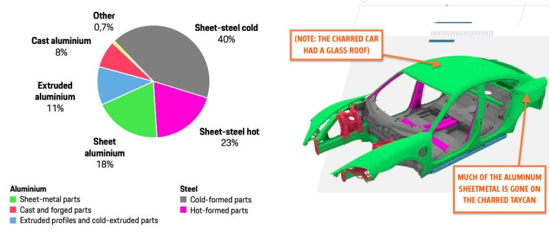 Y esta imagen muestra lo que hay debajo de la chapa, principalmente acero, pero también un poco de aluminio (como el capó y la sección central del travesaño del techo trasero que se pueden ver hace dos imágenes).