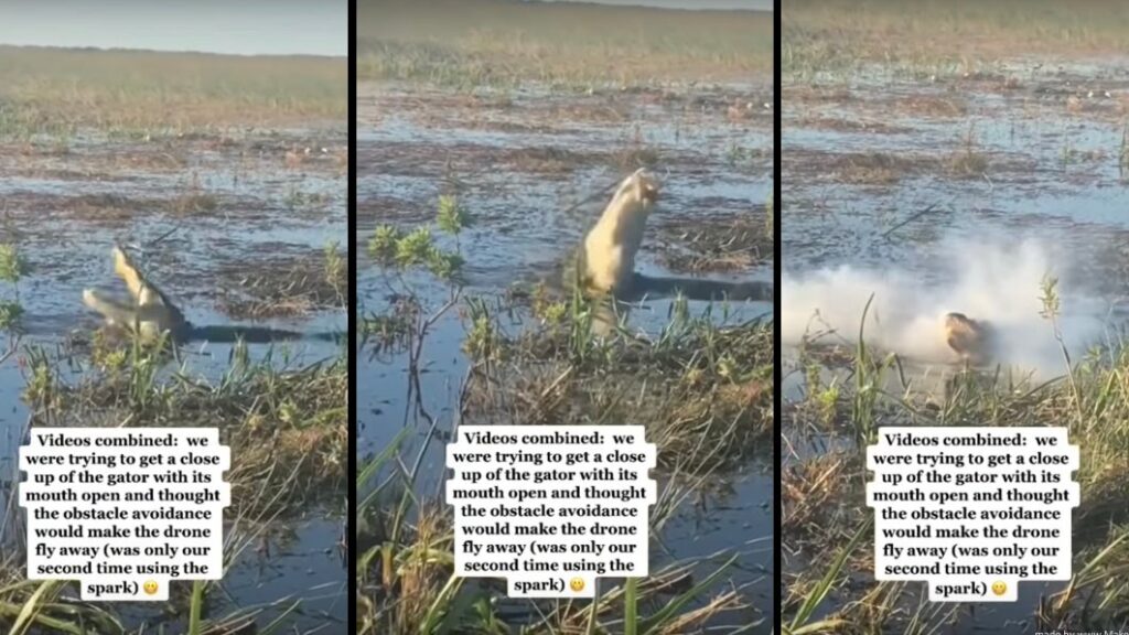 El aligátor atrapó el dron en el aire y empezó a masticarlo, lo que hizo que salieran vapores tóxicos de su boca